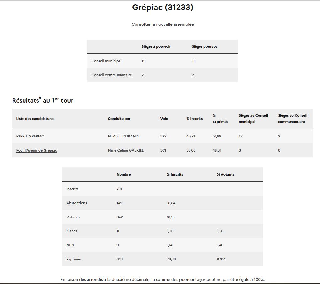 La liste Esprit Grépiac menée par M. Alain Durand a remporté les élections municipales par......