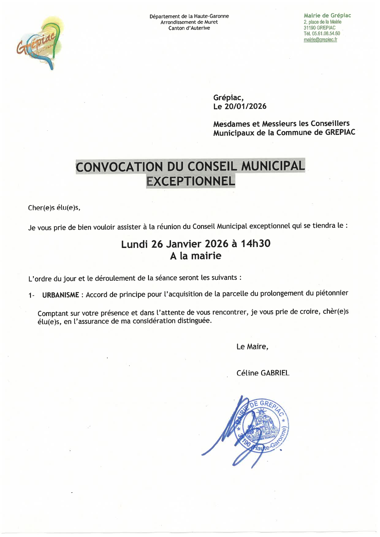 Conseil Municipal Exceptionnel du Lundi 26 janvier 2026