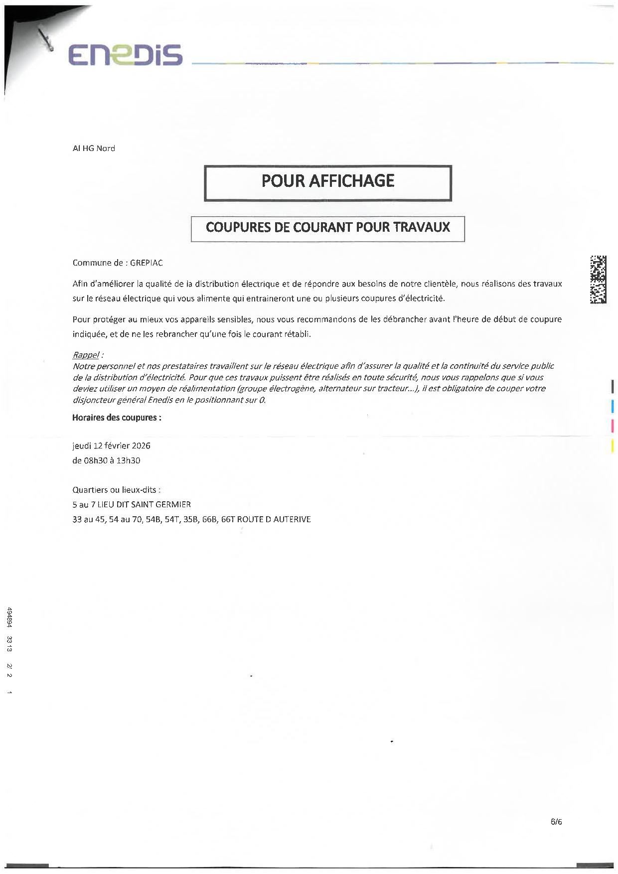 des travaux sur le réseau électrique auront lieu le jeudi 12 février 2026 entre 8h30 et 13h30