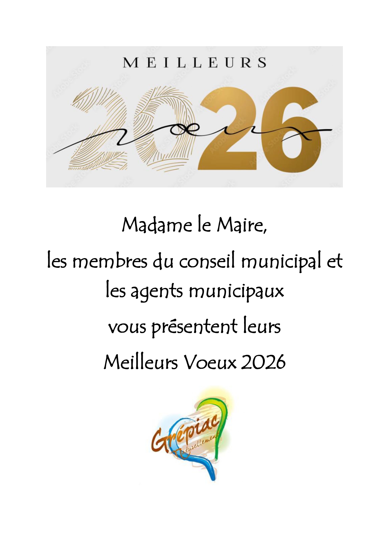 5 janvier 2026 Actualités Meilleurs voeux 2026 Madame le Maire, les membres du conseil municipal et les agents municipaux vous présentent leurs meilleurs vœux 2026 BY Mairie 0